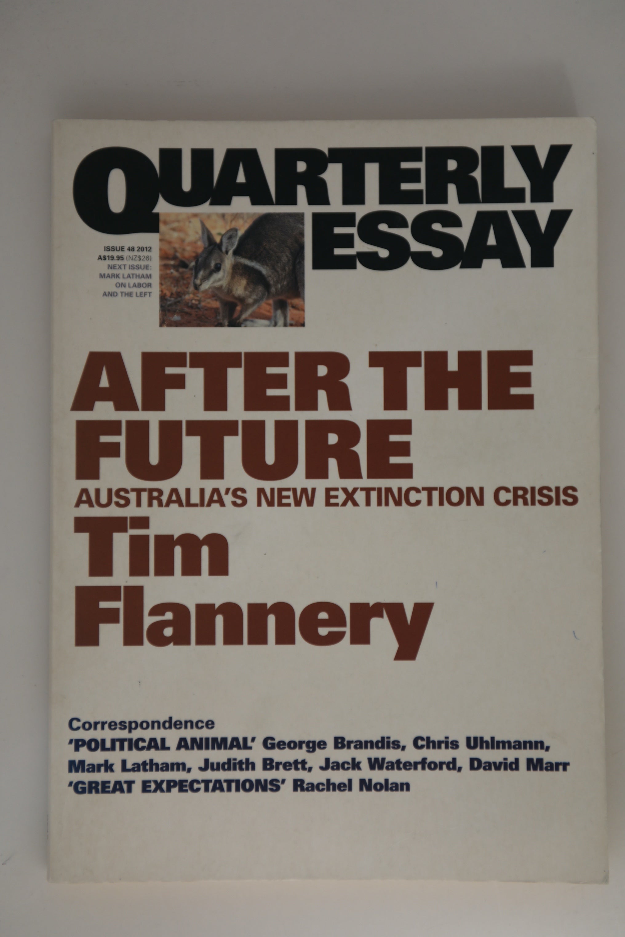 Australia is home to many animals and plants found nowhere else on earth, making Australians caretakers of a unique heritage in a land that tolerates few mistakes. Yet, in After the Future, Tim Flannery shows that this country is now on the brink of a new wave of extinctions, which threatens to leave our national parks as marsupial ghost towns. Why are species becoming extinct despite the tens of millions of dollars being spent to protect nature? And what more should be done? In this passionate and illuminating essay, Flannery tells the story of the human impact on the continent. He revisits his Future Eaters hypothesis, discussing how firestick farming helped to shape the ecology and preserve native fauna. He looks at the way recent governments, in tandem with an indifferent populace and a rabid libertarian right, have let environmental knowledge and commitments erode. Finally, he describes new approaches to wildlife conservation and argues that Australia must take the lead on these. This is an essay that rings the alarm on behalf of the natural world, and asks us to think again about protection of its irreplaceable riches. Such is the depth of public ignorance about Australia's extinction crisis that most people are unaware that it is occurring, while those who do know of it commonly believe that our national parks and reserves are safe places for threatened species. In fact the second extinction wave is now in full swing, and it's emptying our national parks and wildlife reserves as ruthlessly as other landscapes.-Tim Flannery, After the Futurei Correspondence This issue also contains correspondence relating to the previous issue QE47 Political Animal: The Making of Tony Abbott by David Marr.