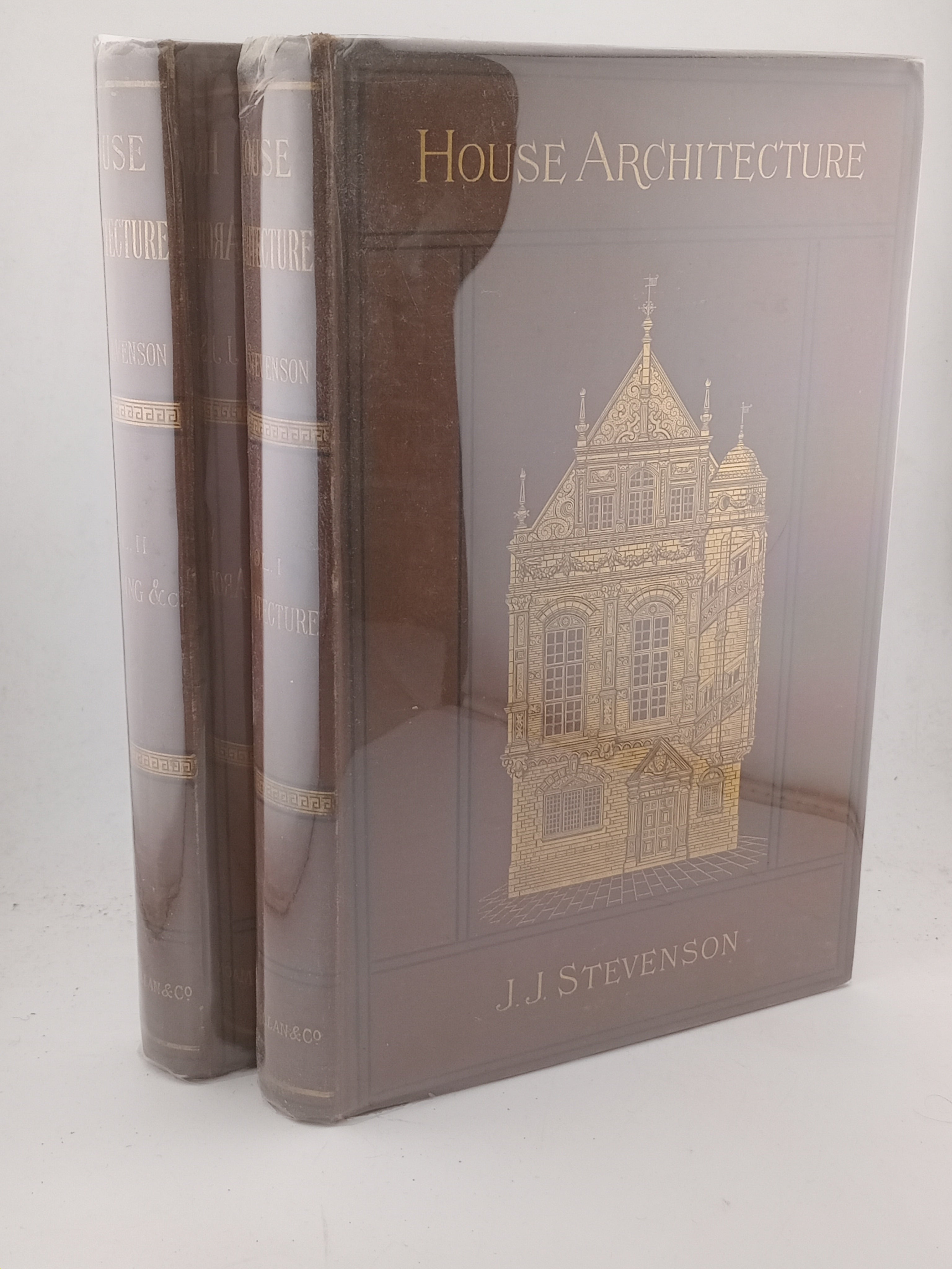 2 vols in brown buckram library binding, well illustrated, 383pps and 280pps + index. 1st editions. Stevenson was the first architect to produce designs in the "Queen Anne" style. Volume I is a study of architecture from ancient times through the Renaissance, while Volume II deals with house planning.