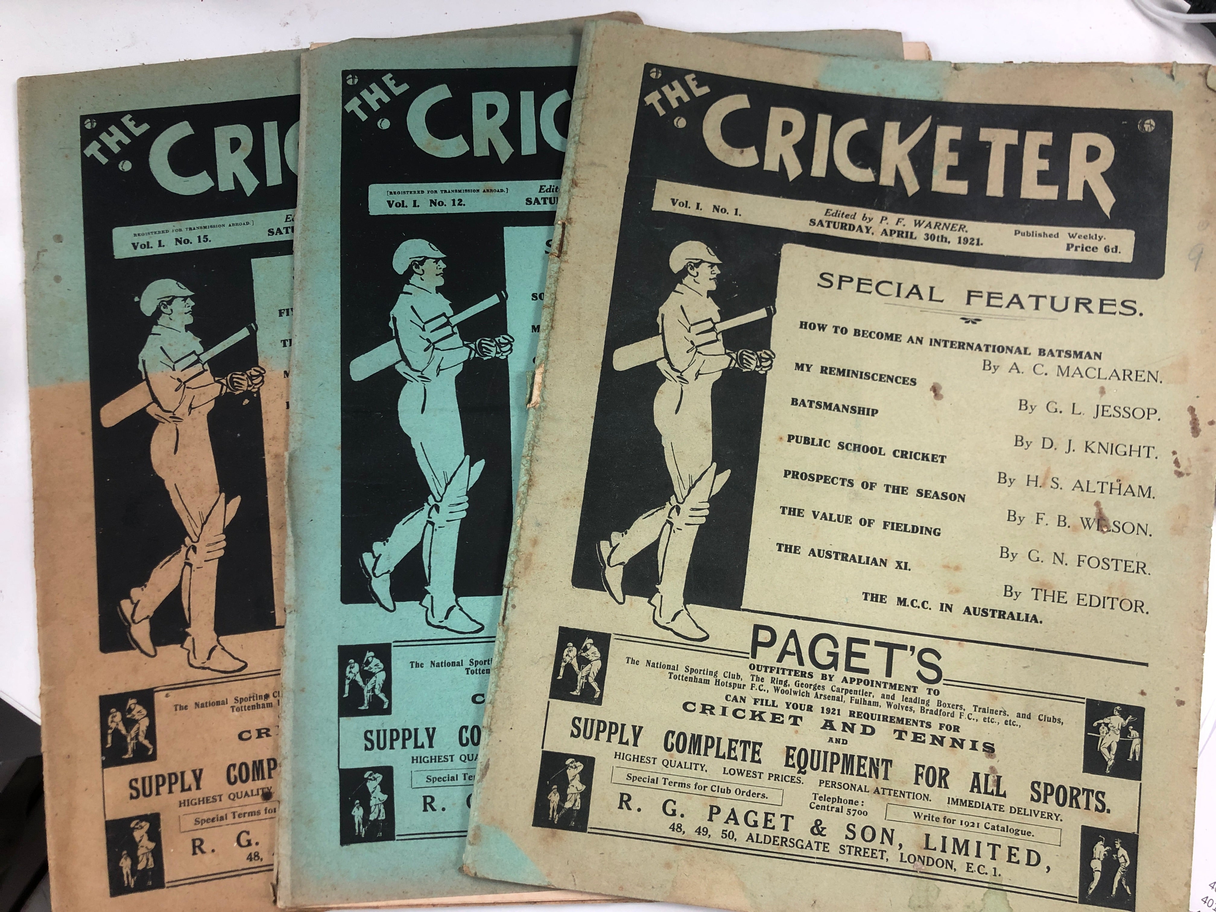 The Cricketer Magazine 1921 (3 issues) by P.F Warner (editor)