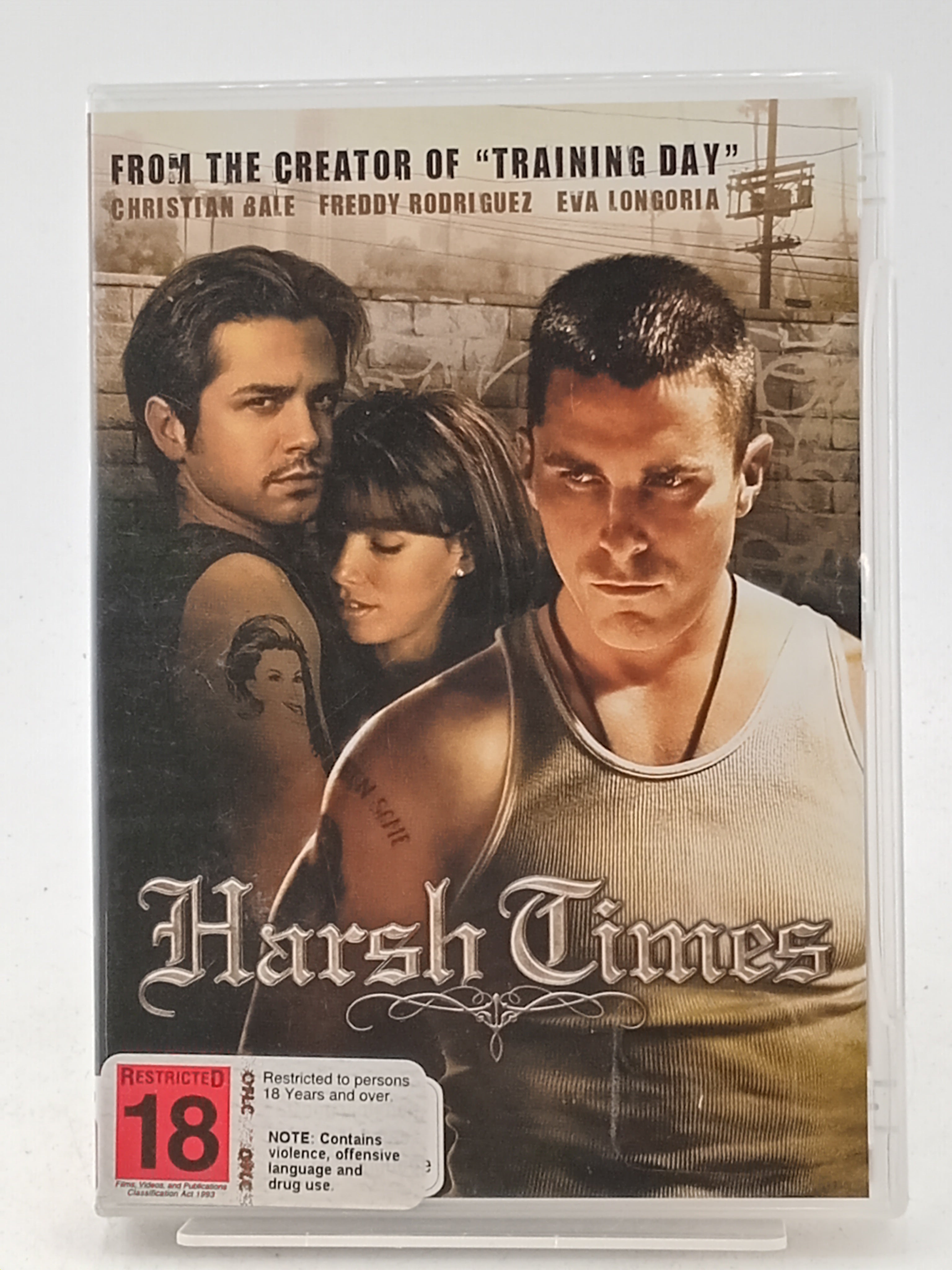 Haunted by nightmares from his murderous military past, the honourably discharged Jim (Christian Bale) spends his time between his impoverished fiance in rural Mexico and cruising the streets of east L.A., with his buddy Mike (Freddy Rodriguez). They fool Mike's girlfriend (Eva Longoria) into thinking he's actually dropping off resumes. Homeland Security meanwhile wants to recruit Jim for some special ops, but first he has to pass a urine test. This is the directorial debut of David Ayer, who wrote TRAINING DAY. Christian Bale delivers, as usual, a towering performance: growing progressively more disturbed as the film goes on, he weeps, roars, struts, shouts and flips out, maintaining audience sympathy all the while.