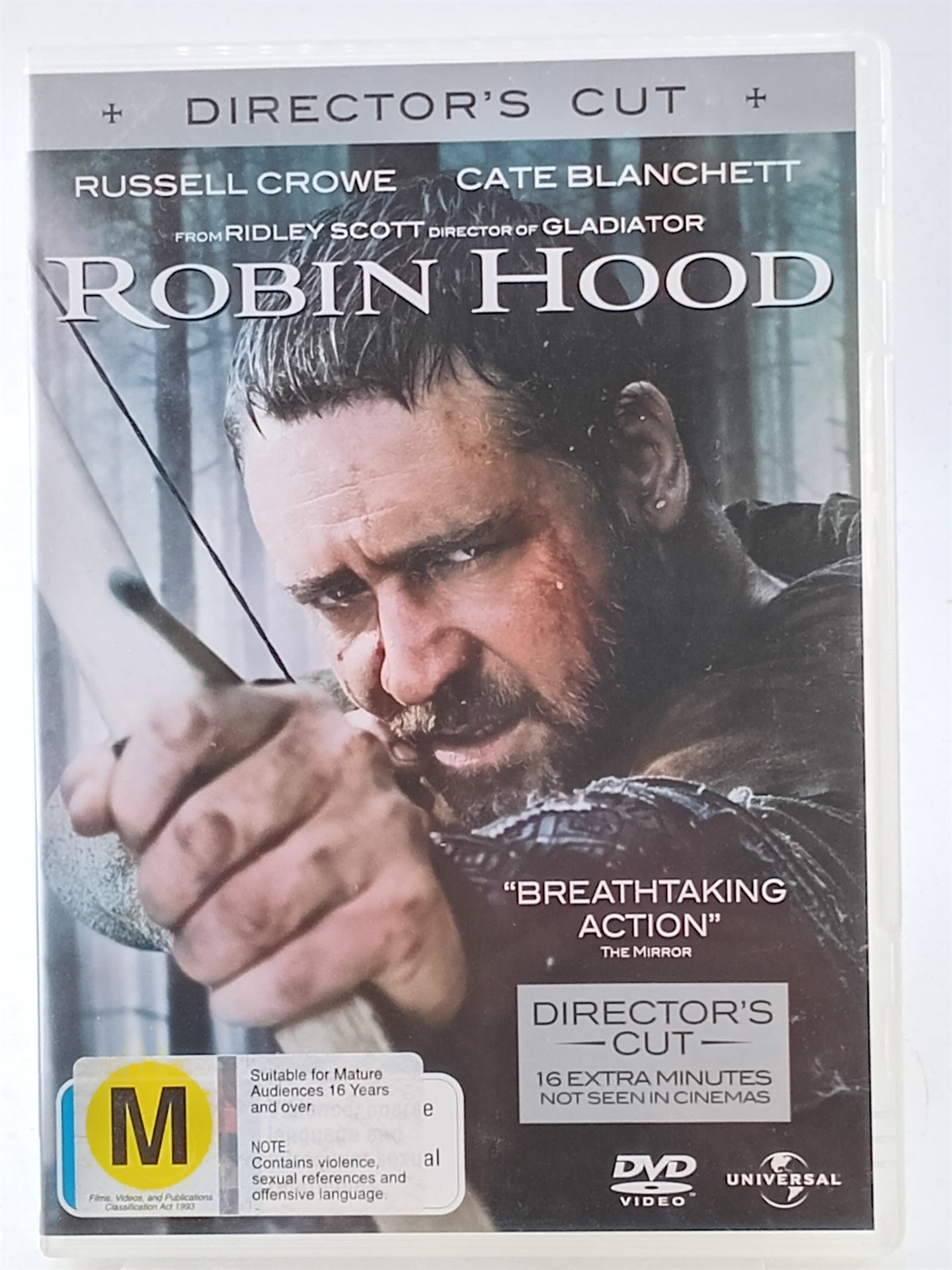 Russell Crowe stars as Robin Longstride in director Ridley Scott's big-budget twist on the celebrated legend. When soldier Robin happens upon the dying Robert of Loxley, he promises to return the man's sword to his family in Nottingham. There, he assumes Robert's identity; romances his widow, Marion (Cate Blanchett); and draws the ire of the town's sheriff (Matthew Macfayden) and King John's henchman, Godfrey (Mark Strong).