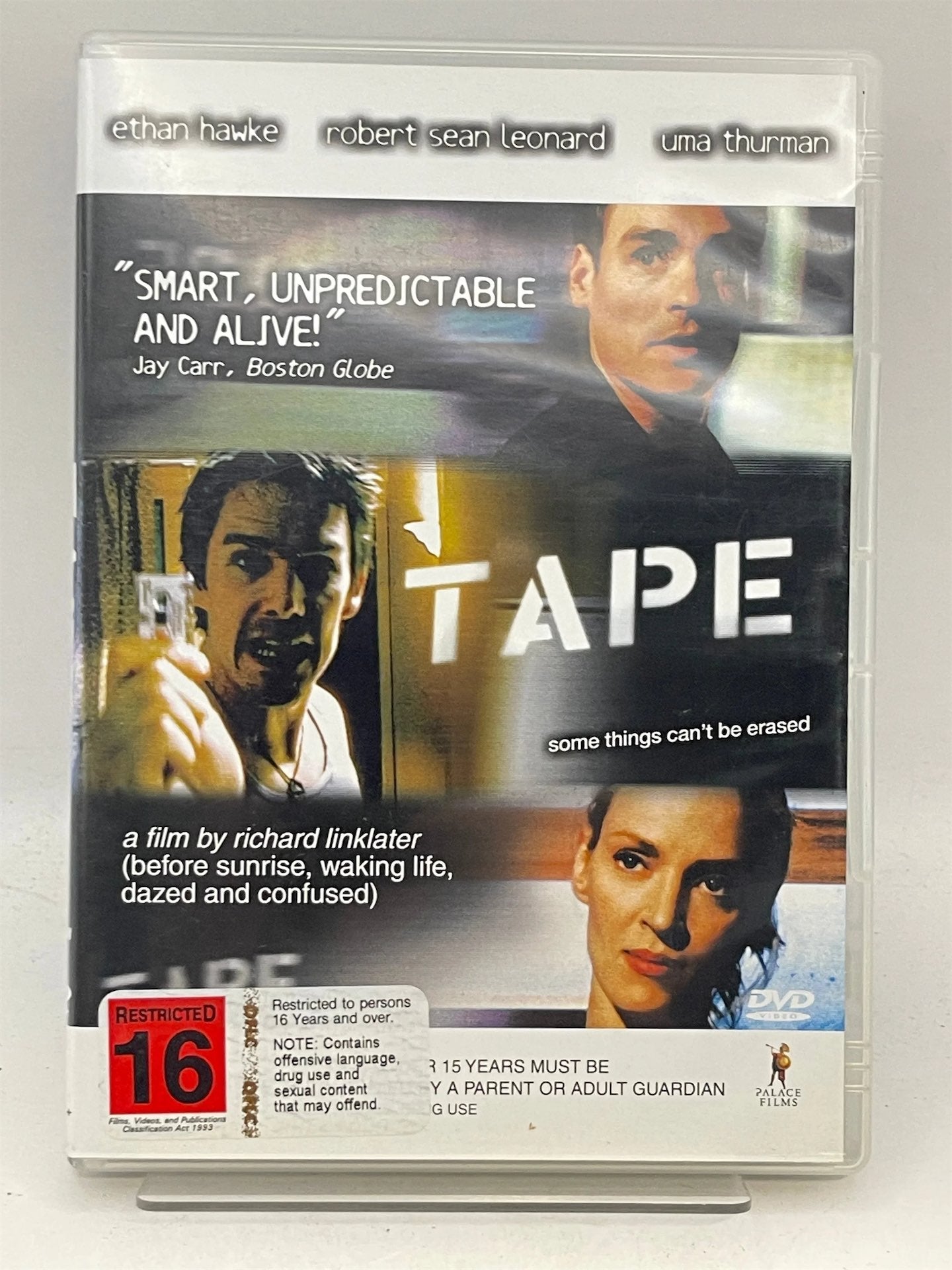 Based on a three-character, one-act play, Tape is set in a seedy Michigan motel room. The room is rented by Vince (Ethan Hawke), an ill-tempered but gregarious party animal who has returned to Michigan to attend the premier of his friend John's (Robert Sean Leonard) documentary at a local film festival. When the pair get together to reminisce, events take a dramatic and unexpected turn. Plunging the two men and another high-school friend (Uma Thurman) into an evening of unforgettable tension.