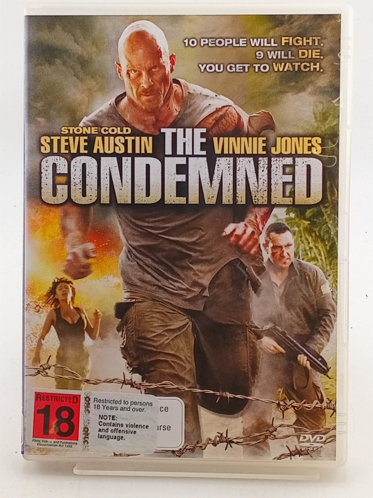Ten people will fight, nine will die, and you get to watch. WWE wrestler, \"Stone Cold\" Steve Austin stars as death-row inmate who gets a rare shot at freedom if he can kill nine other contestants in an illegal game to be broadcast over the internet. From the producers of See No Evil and co-starring Vinnie Jones, The Condemned is a no-holds barred, action extravaganza that is a must see for fans of films like The Running Man and Hard Target.