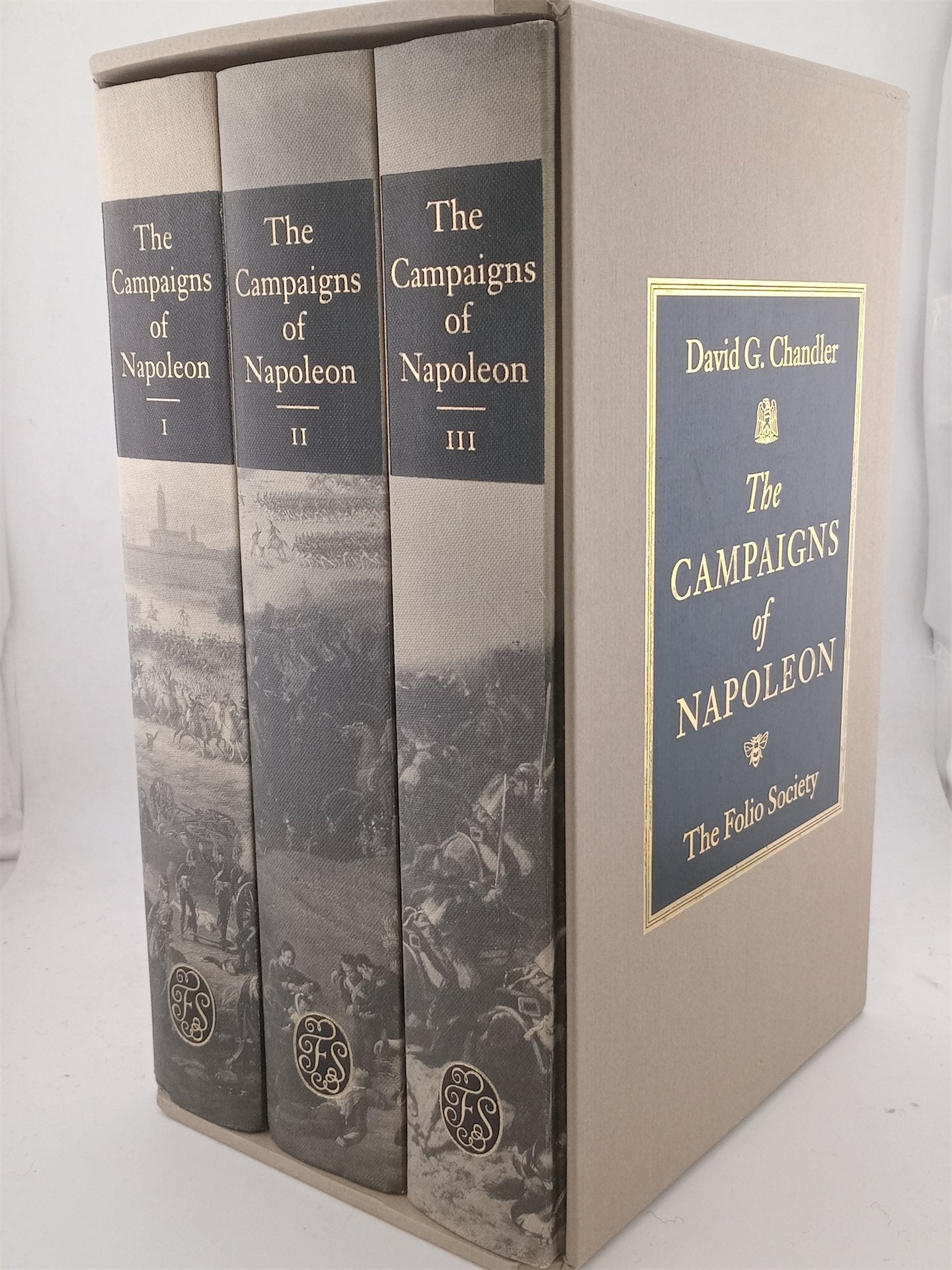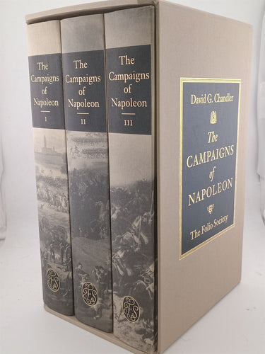 Campaigns of Napoleon, The by David G.Chandler. (3v.). Vol1. The Rise, February 1793–1805, 18 pages of colour plates, 386pp. Vol2. The Zenith, September 1805–September 1812, 22 pages of colour plates, 436pp. Vol3. The Decline. September 1812–June 1815, 14 pages of colour plates, 431pp. Maps by Reginald Piggott and Sheila Waters. Bound in grey cloth printed with a brown painting. Slipcase gilt titled. 25.2x18.2cm.