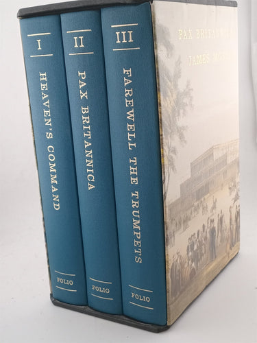 Pax Britannica by James Morris (3v.), with 32 pages of prints, paintings and photographs in each volume. Full blue buckram with a Victorian sovereign design in gold and blind, endleaves printed in colour. Black three-volume slipcase. 23.8 x 16.2 cm. 1. Heaven's Command 470 pp. 2. Pax Britannica 410 pp. 3. Farewell the Trumpets 482 pp.