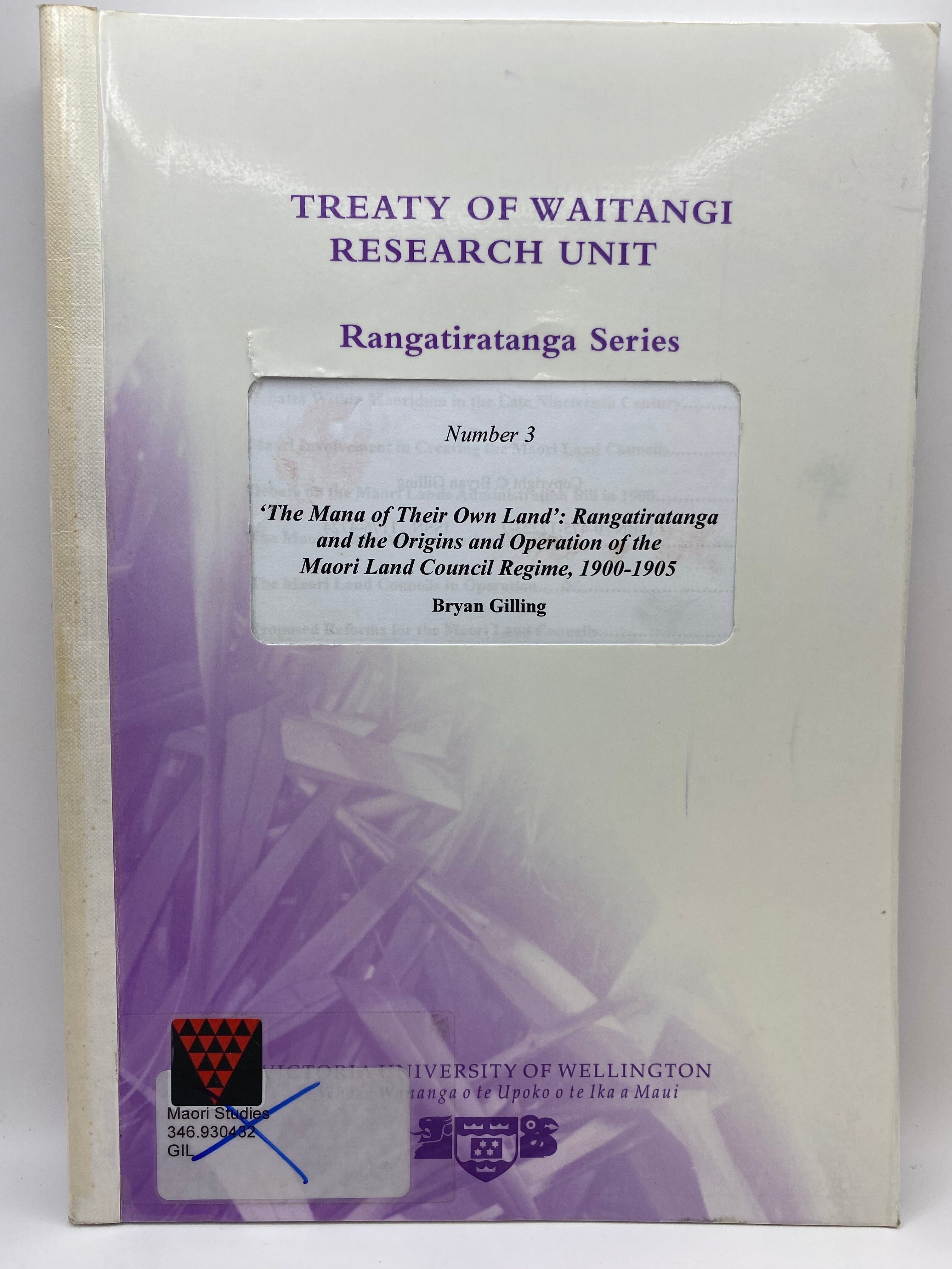 Title: The mana od their own land. Rangatiratanga and the origins and operation of the Maori land council regime 1900 -1905. Rangatiratanga series no 3.
