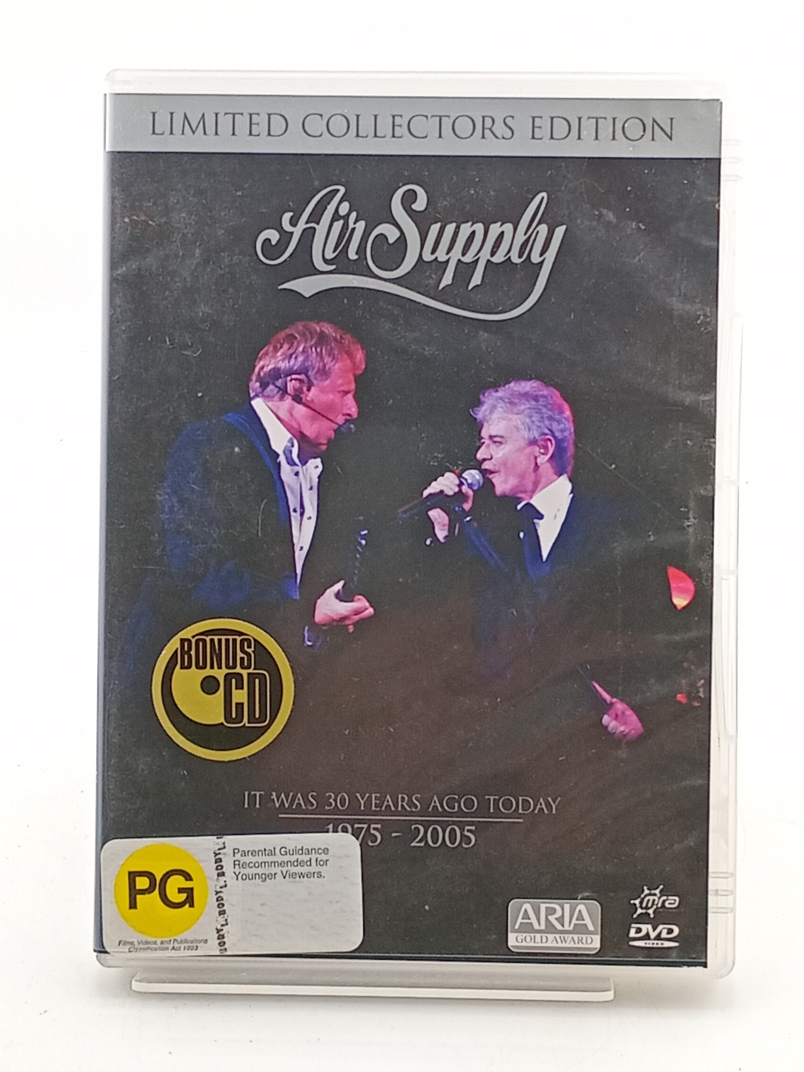 \" Air Supply celebrates the incredible 30 year partnership of Russell Hitchcock & Graham Russell. This exclusive DVD is a not-to-be missed, once in a lifetime experience with time capsule interviews and a candid behind-the-scenes record of three decades of Air Supply magic. With concert, studio and on-the-road footage never seen before, be there to share the good times and the sad, the successes and the strains, the labour and rewards of what it takes to be one of the world's top performing duos for three decades. The concert is a truly memorable performance which includes All Out Of Love, Here I Am, Even The Nights Are Better, and Lost In Love, and took place August 13-14 2004 at Casino Rama - Ontario\" DVD 01 . Now And Forever 02 . Shadow/Sweet Dreams 03 . Even the Nights Are Better 04 . Here I Am (Just When I Thought I was Over You) 05 . Chances 06 . Miracles 07 . Ill Find You 08 . Solos 09 . Two Less Lonely People In The World 10 . The One That You Love 11 . Lost In Love 12 . Every Woman In The World 13 . Making Love Out Of Nothing At All 14 . All Out Of Love 15 . Goodnight CD 01 . Now And Forever 02 . Shadow Of The Sun 03 . Sweet Dreams 04 . Even the Nights Are Better 05 . Here I Am (Just When I Thought I was Over You) 06 . Chances 07 . Someone 08 . Miracles 09 . Ill Find You 10 . Two Less Lonely People In The World 11 . The One That You Love 12 . Lost In Love 13 . Every Woman In The World 14 . Making Love Out Of Nothing At All 15 . All Out Of Love 16 . Goodnight