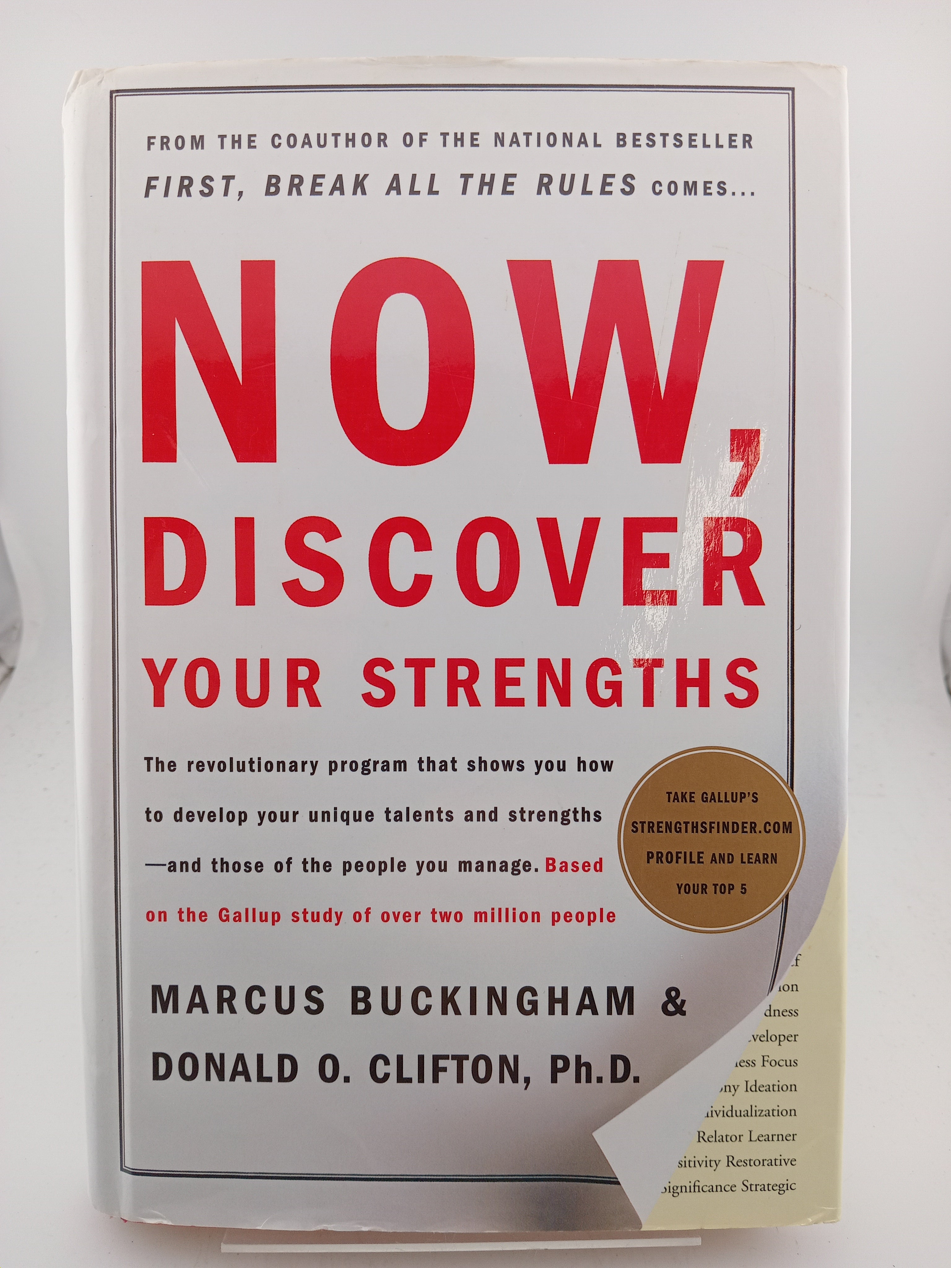 The 20th anniversary edition includes a unique access code to take CliftonStrengths — previously known as StrengthsFinder 2.0 — which is a significantly more robust program than the assessment that appeared in the original edition of the book. This web-based assessment analyzes your instinctive reactions and immediately presents you with your top five themes.