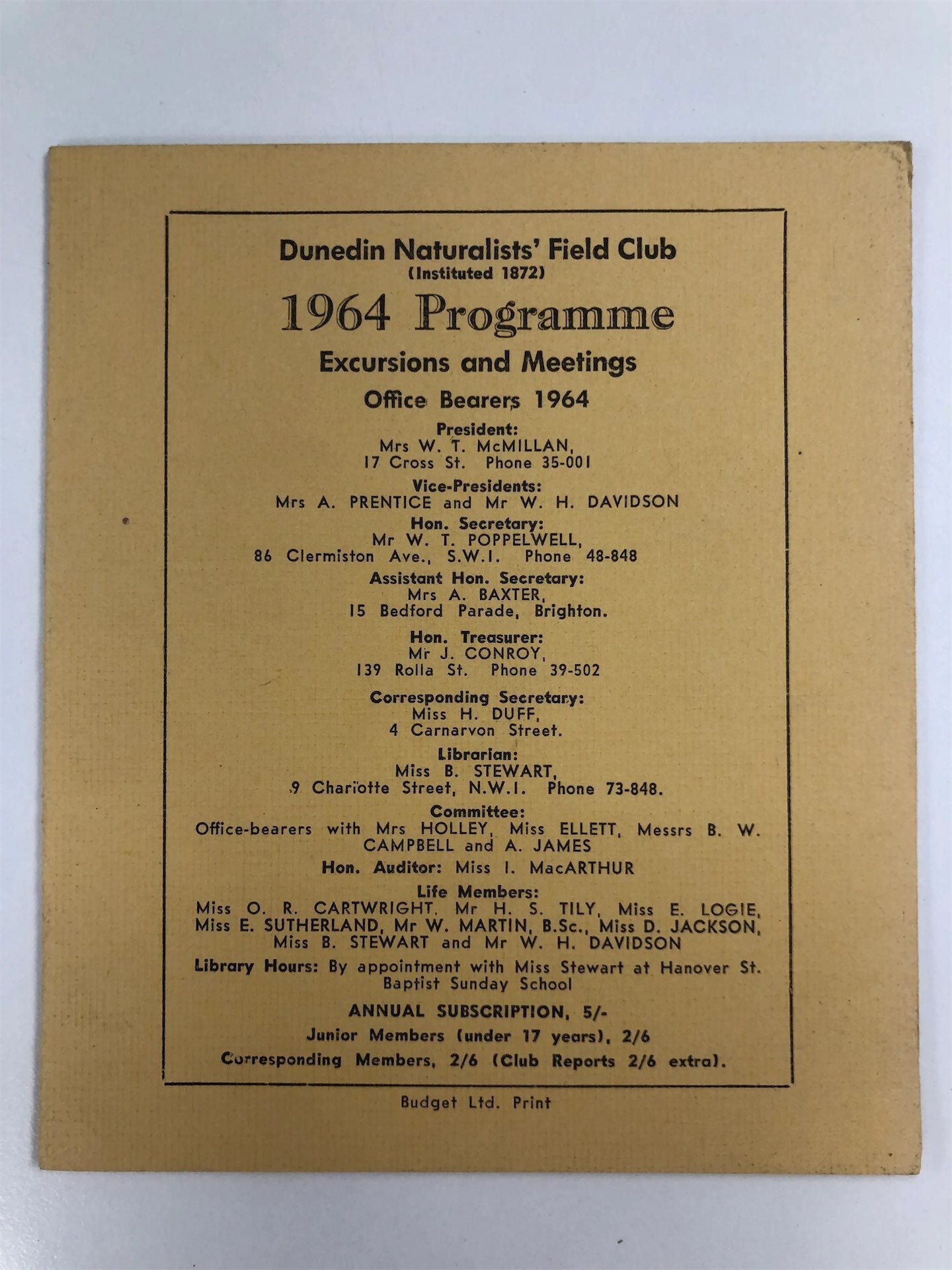 Dunedin naturalist's field club 1964 programme by Dunedin Naturalists Field Club