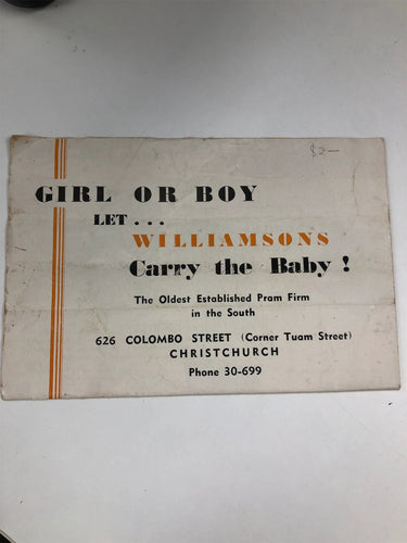 Girl or boy let Williamsons carry the baby -the oldest established pram firm in the South-626 Colombo St Christchurch by Christchurch Williamsons