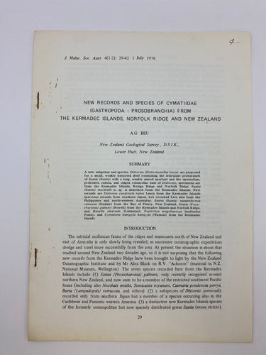 New records and species of Cymatiidae (Gastropoda: prosobranchia) from the Kermadec islands Norfolk ridge by A G. Beu